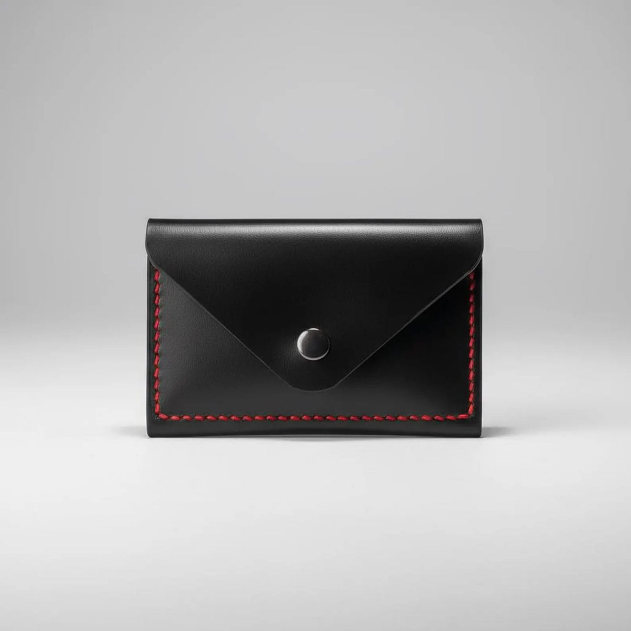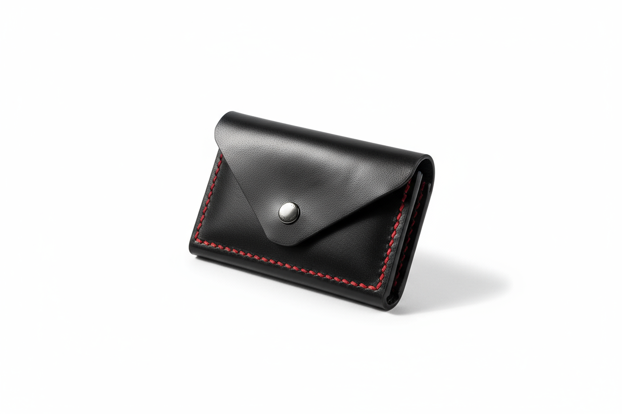 handmade leather card holder black red stitching